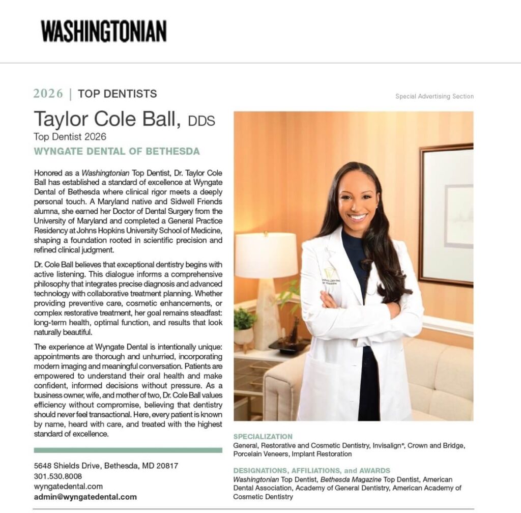 Wyngate Dental of Bethesda and Dr. Taylor Cole Ball have been featured in Washingtonian Magazine as one of the area’s top dentists—an honor that reflects our commitment to personalized, high-quality care and exceptional patient experiences.